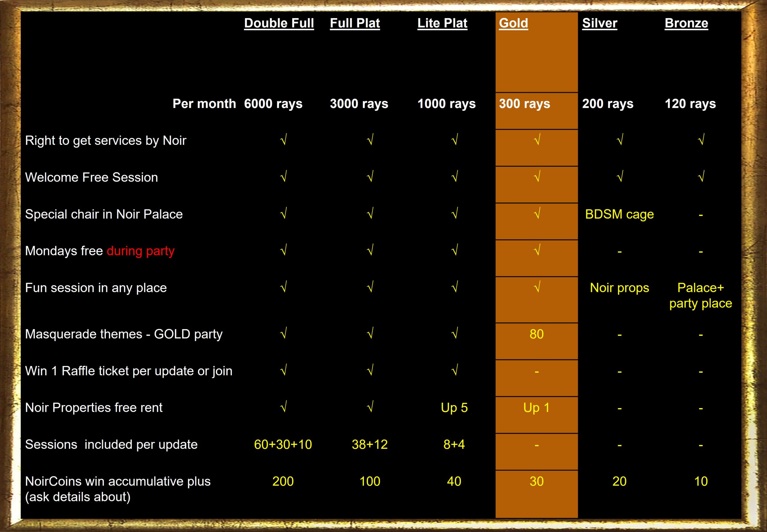 Membership benefits are not negotiable and may be modified, suspended, or revoked at the discretion of Noir Palace management.